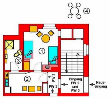 Diese Wohnung eignet sich für 2 Personen, wobei bei Bedarf ein Ehebett gestellt werden kann. In Verbindung mit der unmittelbar angrenzenden Ferienwohnung 3 können in diesem Bereich zurzeit maximal 4 Personen übernachten. Die aktuelle Preisliste entnehmen Sie bitte der Tabelle am unteren Ende dieser Seite. Auf der Seite Preise / Info finden Sie eine Übersicht der Preise aller Ferienwohnungen sowie sonstige wichtige Informationen. Wollen Sie buchen, dann klicken Sie hier. Erläuterung der Wohnung: 1) Zweibettzimmer 2) Küche 3) Bad/Dusche/WC 4) Terrasse | |