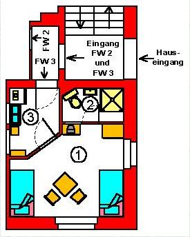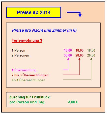 Dieses Appartement ist für 2 Personen gedacht., wobei bei Bedarf ein Ehebett gestellt werden kann. In Verbindung mit der unmittelbar angrenzenden Ferienwohnung 2 können in diesem Bereich zurzeit maximal 4 Personen übernachten. Perspektivisch ist geplant, die Ferienwohnung 3 mit einer Küche zu erweitern (analog der Ferienwohnung 2), die sich zurzeit in der Vorbereitung befindet und unmittelbar am Flur (3) angrenzen wird. Die aktuelle Preisliste entnehmen Sie bitte der Tabelle am unteren Ende dieser Seite. Auf der Seite Preise / Info finden Sie eine Übersicht der Preise aller Ferienwohnungen sowie sonstige wichtige Informationen. Wollen Sie buchen, dann klicken Sie hier.