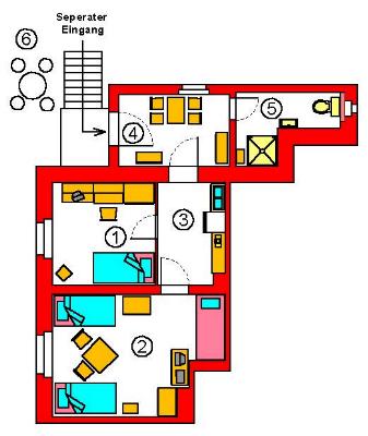 Dieses Appartement vermieten wir entweder als komplette Wohnung bzw. jedes Zimmer einzeln, so dass eine Nutzung entsprechend des Bedarfs möglich ist. Die aktuelle Preisliste entnehmen Sie bitte der Tabelle am unteren Ende dieser Seite. Auf der Seite Preise / Info finden Sie eine Übersicht der Preise aller Ferienwohnungen sowie sonstige wichtige Informationen. Wollen Sie buchen, dann klicken Sie hier. Erläuterung der Wohnung: 1) Einbettzimmer 2) Zweibettzimmer 3) Küche 4) Aufenthaltsraum 5) Bad, Dusche, WC 6) Terrasse mit Sitzgruppe |